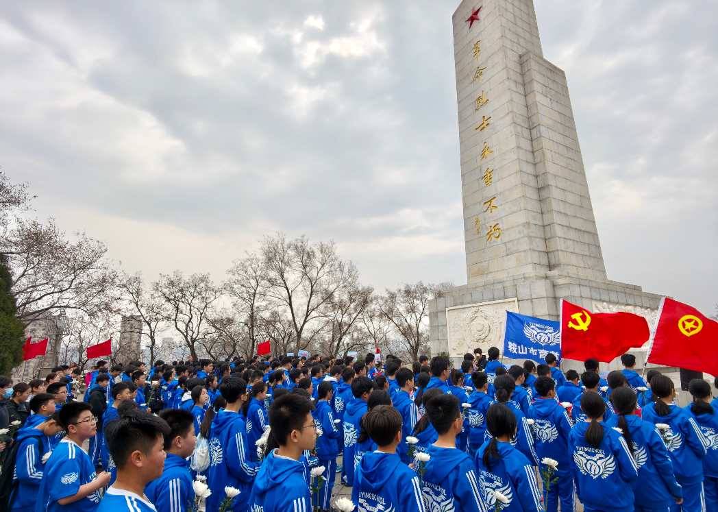 在烈士纪念碑前,全体师生肃立默哀、敬献花篮,学生代表讲述鞍山解放战役英烈事迹。在老干部与“五老”志愿者的共同见证下,同学们庄严宣誓,以铿锵誓言表达铭记英烈、赓续红色血脉的坚定信念。