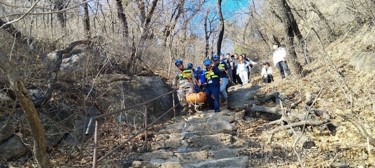 下午两点左右,指挥中心再次接到求助,称景区内有游客受伤急需救援。经研判符合救援条件,救援平台即刻启动。正在附近景区执行保障任务的队员前往伤者所在位置开展救援,同时召集其他队员迅速集结并赶赴现场。下午两点十五分左右,于辉、肖建东抵达受伤游客所在位置,立即开展检伤与包扎处理,半小时后第一梯队7名队员组成转运小组,将伤者向山下转运。