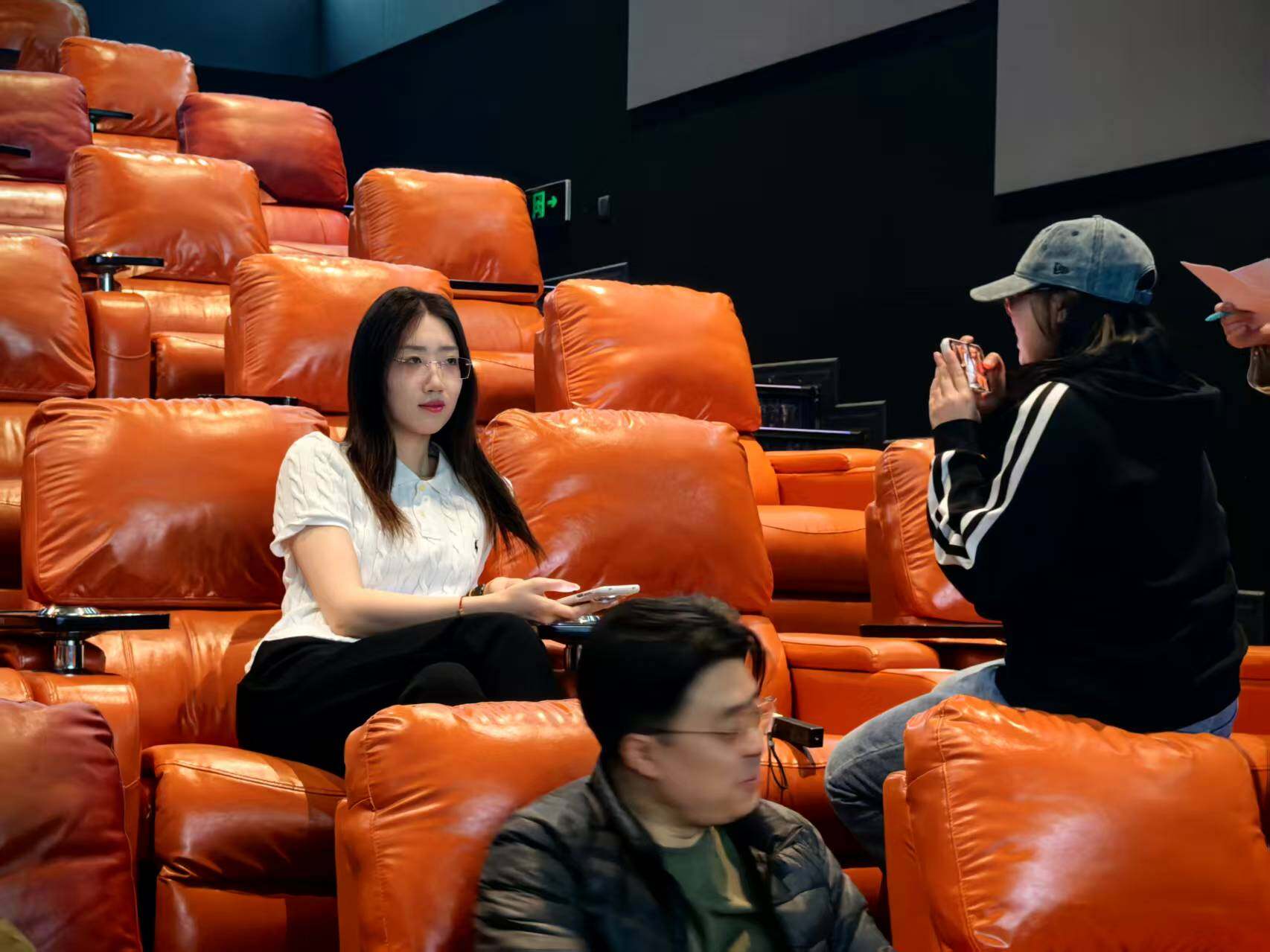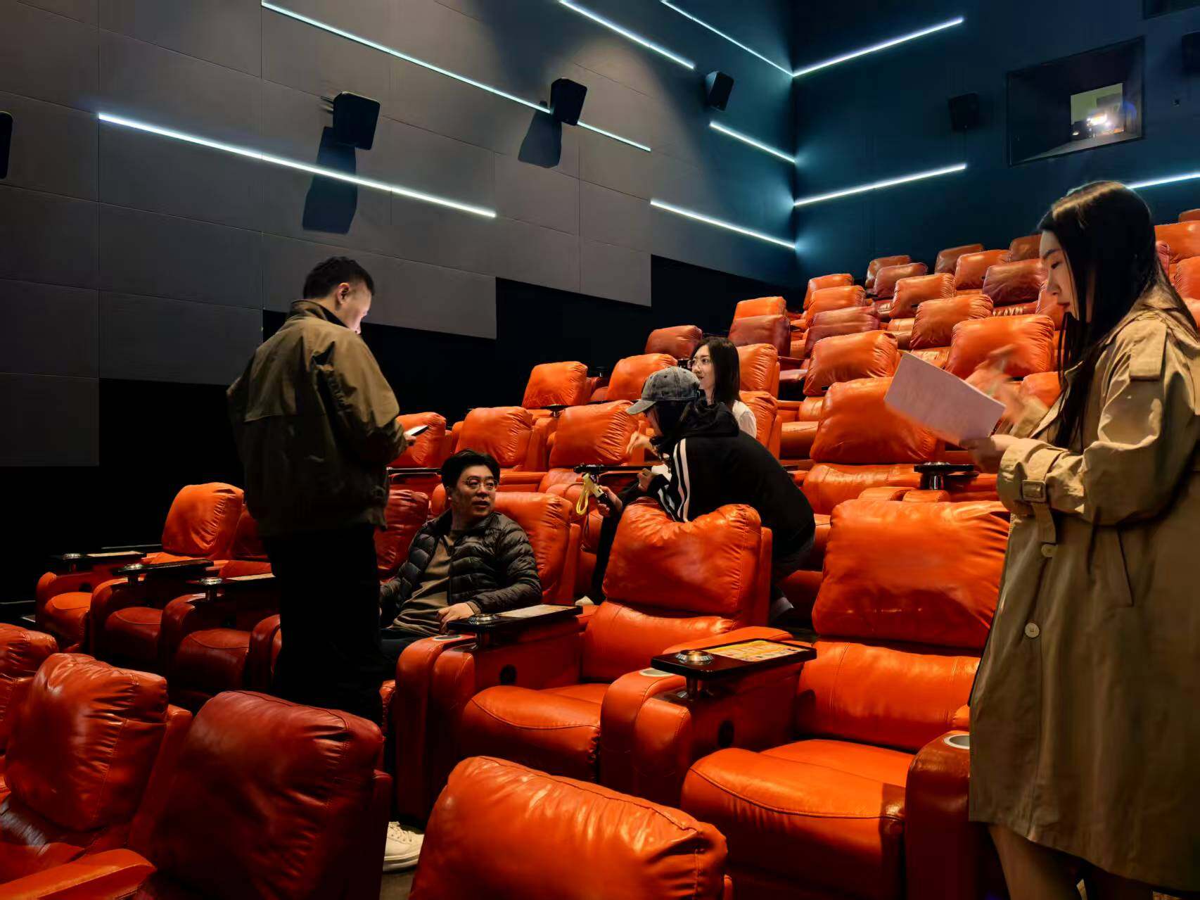 现场没有华丽的布景,苏宁影院的休息区、观影厅入口等场景被就地利用,参演人员都是铁西区委宣传部的工作人员,没有专业的表演经验,却个个精神饱满、认真投入。大家分工明确,有人负责统筹调度,有人扮演角色,有人举着手机拍摄,还有人在一旁琢磨台词、调整动作,现场氛围忙碌又热闹。