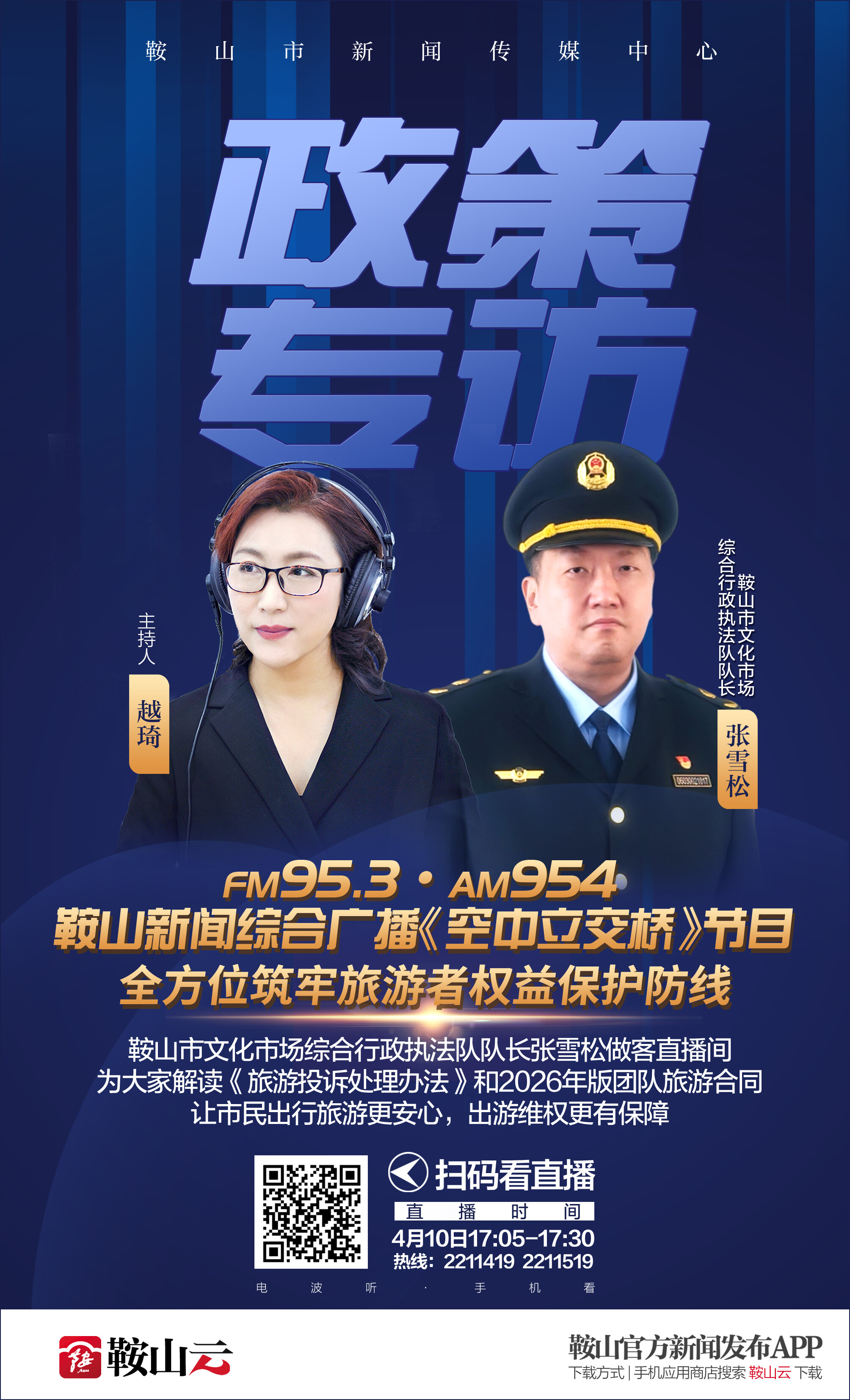 两大新政有何亮点,有哪些重大调整?旅游纠纷如何高效维权?合同签约要注意哪些关键事项?10日17:05《政策专访》邀请鞍山市文化市场综合行政执法队队长张雪松做客直播间,为大家解读《旅游投诉处理办法》和2026年版团队旅游合同,让市民出行旅游更安心,出游维权更有保障。届时将开通直播间的两部热线电话2211419、2211519回应听众的疑虑和问询。欢迎您锁定FM95.3、AM954鞍山新闻综合广播收听节目,更可以打开手机鞍山云APP收看视频直播。广播视频化,好声音看得见!