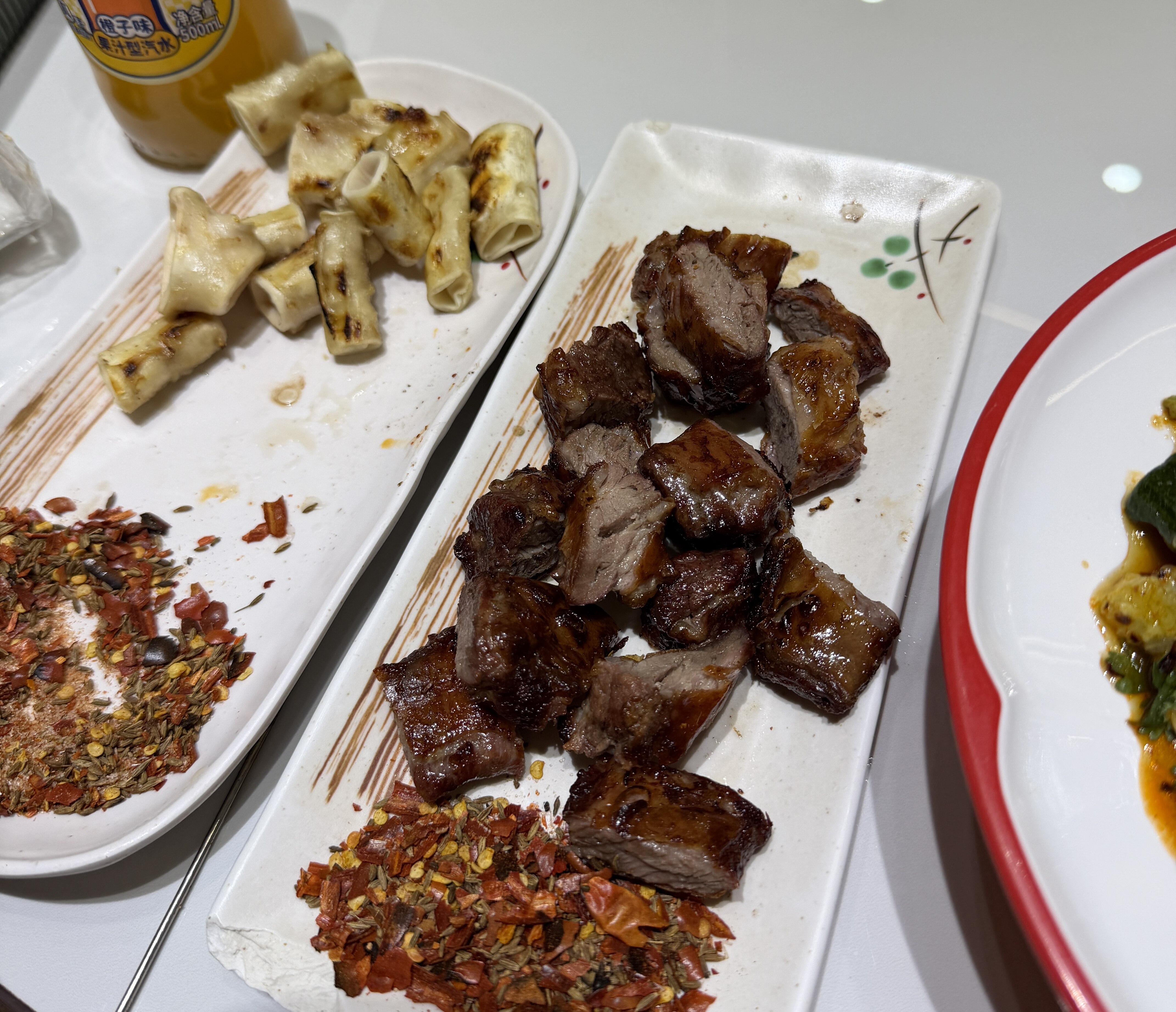 除了炖菜,三里桥的烤串更是将“烟火气”拉满。烤条管选用新鲜猪心管,整条穿签后置于炭火上烤制,烤至表面微焦起泡,剪段后蘸上秘制干料,咸香酥脆,越嚼越香,独特的脆弹口感在其他烧烤店难得一见;烤条肉则是三里桥的招牌特色,实则为护心肉油边,整条烤制后外皮焦脆、内里爆汁,无需复杂腌制,仅靠炭火激发肉香,搭配桌上的辣椒面、孜然粉,一口下去满是肉汁与香料的交融,成为食客必点的“硬通货”。