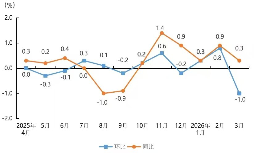 与2026年2月相比,八大类商品及服务价格呈现“二升五降一平”态势。其中,衣着和交通通信价格分别上涨0.5%和0.2%;食品烟酒及在外餐饮价格下降2.8%、生活用品及服务价格下降1.2%、其他用品及服务价格下降1.1%、教育文化娱乐和医疗保健价格均下降0.2%;居住价格持平。