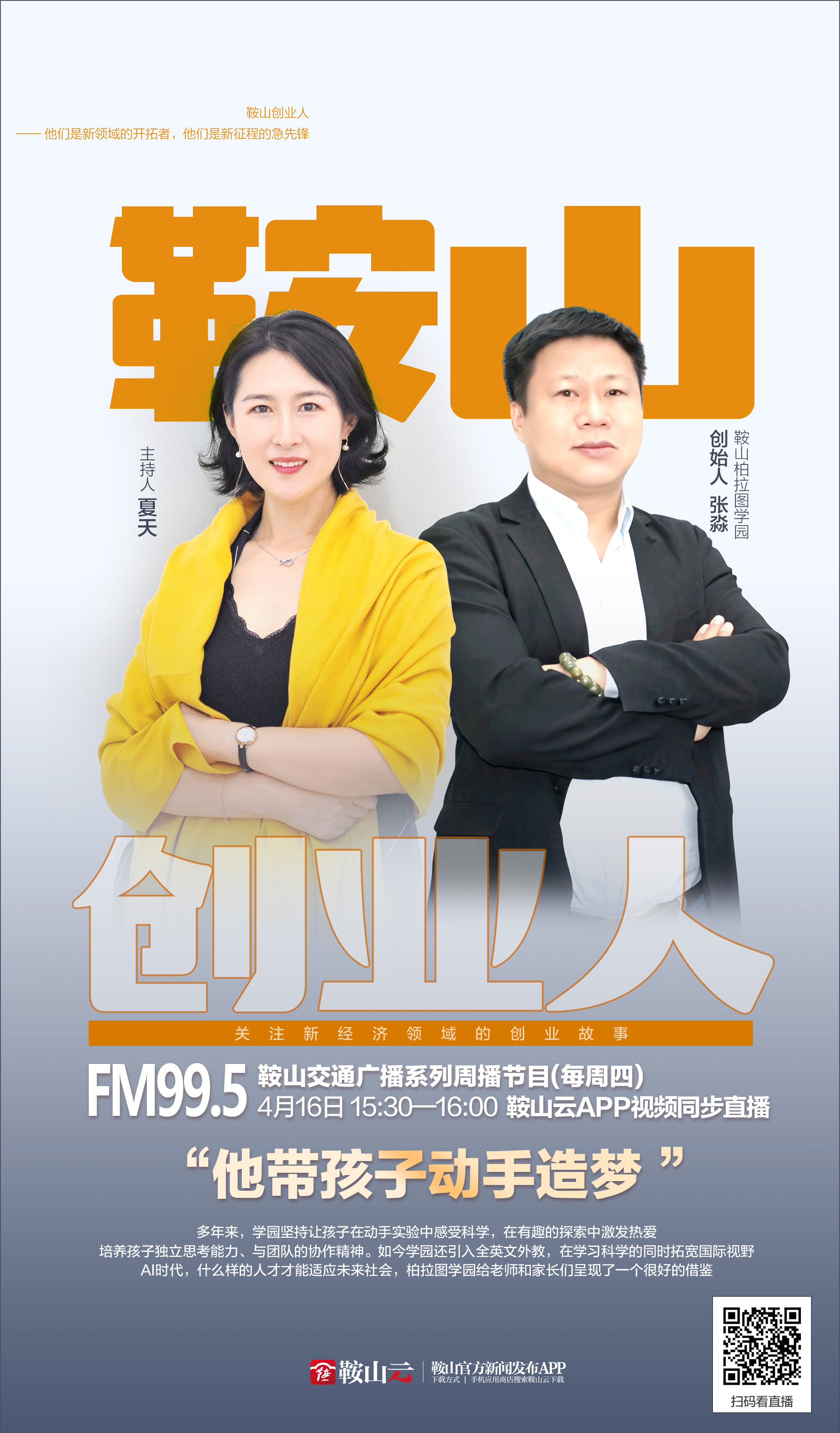 4月16日15:30——16:00,鞍山广播电视台交通广播、调频FM99.5《鞍山创业人》,我们一起聆听鞍山商界的传奇故事。鞍山云APP视频同步直播。