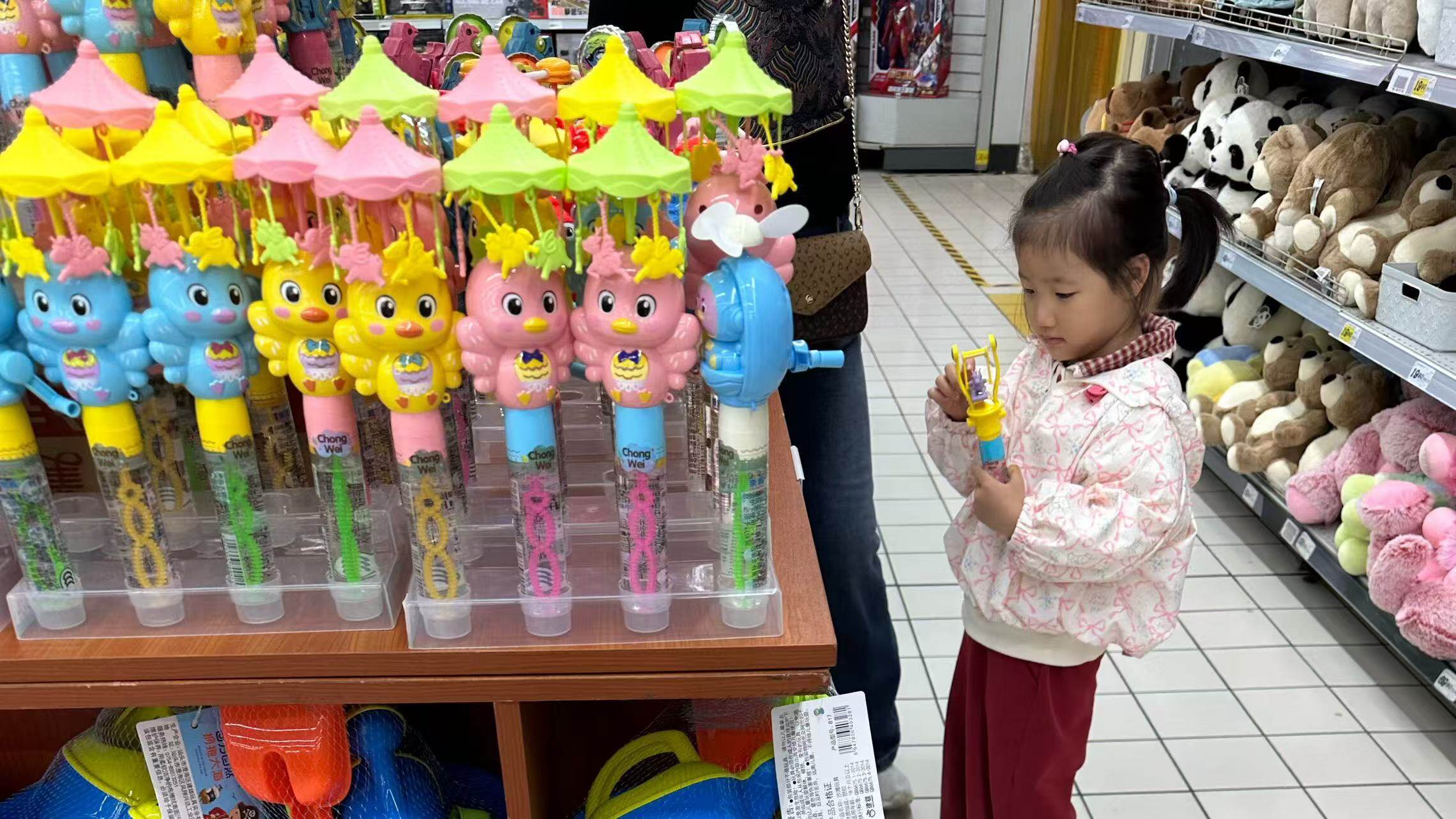 在一家超市的玩具区,泡泡玩具专区格外吸睛,泡泡棒、电动泡泡机、卡通造型泡泡枪整齐陈列,包装上印着“安全无毒”“多泡款”等字样,陆续有消费者选购。一位销售人员介绍,入春后,泡泡玩具销量明显上涨,很多家庭散步、踏青时都会给孩子带,现在泡泡棒、泡泡机是儿童玩具区的销售主角。
