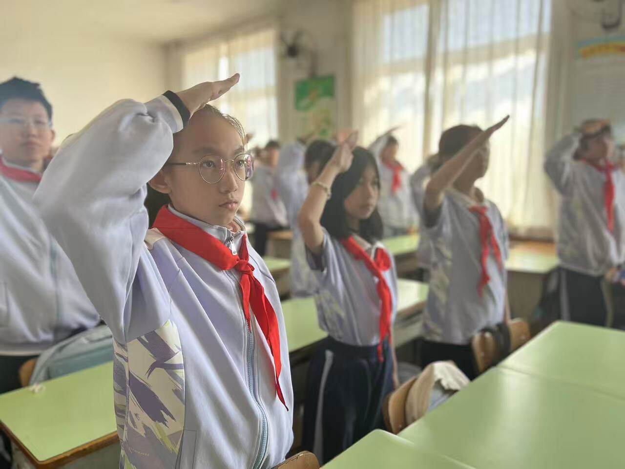 在铁西区逸夫小学,各中队同步开展“山河铭记英雄魂 队礼致敬归乡魂”活动。当屏幕上运-20B专机平稳降落、礼兵庄严护送棺椁前行时,教室里一片肃静,同学们挺直腰板,少先队员自发举起右手,以标准的队礼向跨越山河归来的英烈致以崇高敬意。直播结束后,各中队还举行了分享交流活动。有队员表示:“胸前的红领巾是烈士的鲜血染成的,敬队礼不仅是一种仪式,更是对英雄的承诺。”