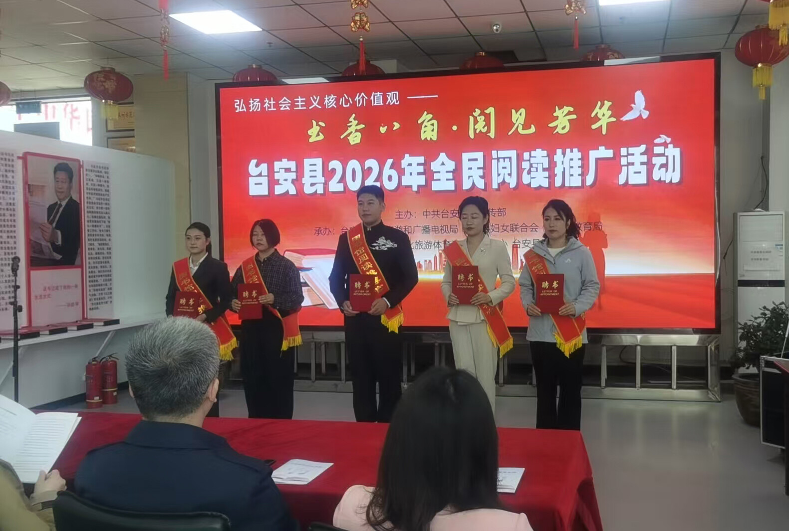 为推动阅读推广走深走实,活动现场举行2026届图书推介官受聘仪式。台安县文旅体事务服务中心主任张嘉乐为来自融媒体、教育、文旅、妇联系统的5名首批图书推介官颁发聘书。他们将化身阅读“点灯人”,走进校园、社区、家庭,带动更多人爱上阅读。