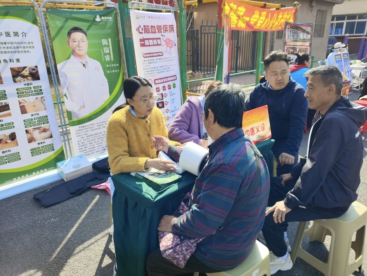 在健康守护板块,居民在摊位前有序排队。中医志愿者一边搭脉问诊,一边耐心为居民讲解养生知识。旁边,肠胃病、口腔、眼科的专业志愿者认真为居民进行基础筛查,普及疾病预防常识。保健按摩志愿者为老人们揉按肩颈、舒缓酸痛,手法专业,居民直呼“舒服”。