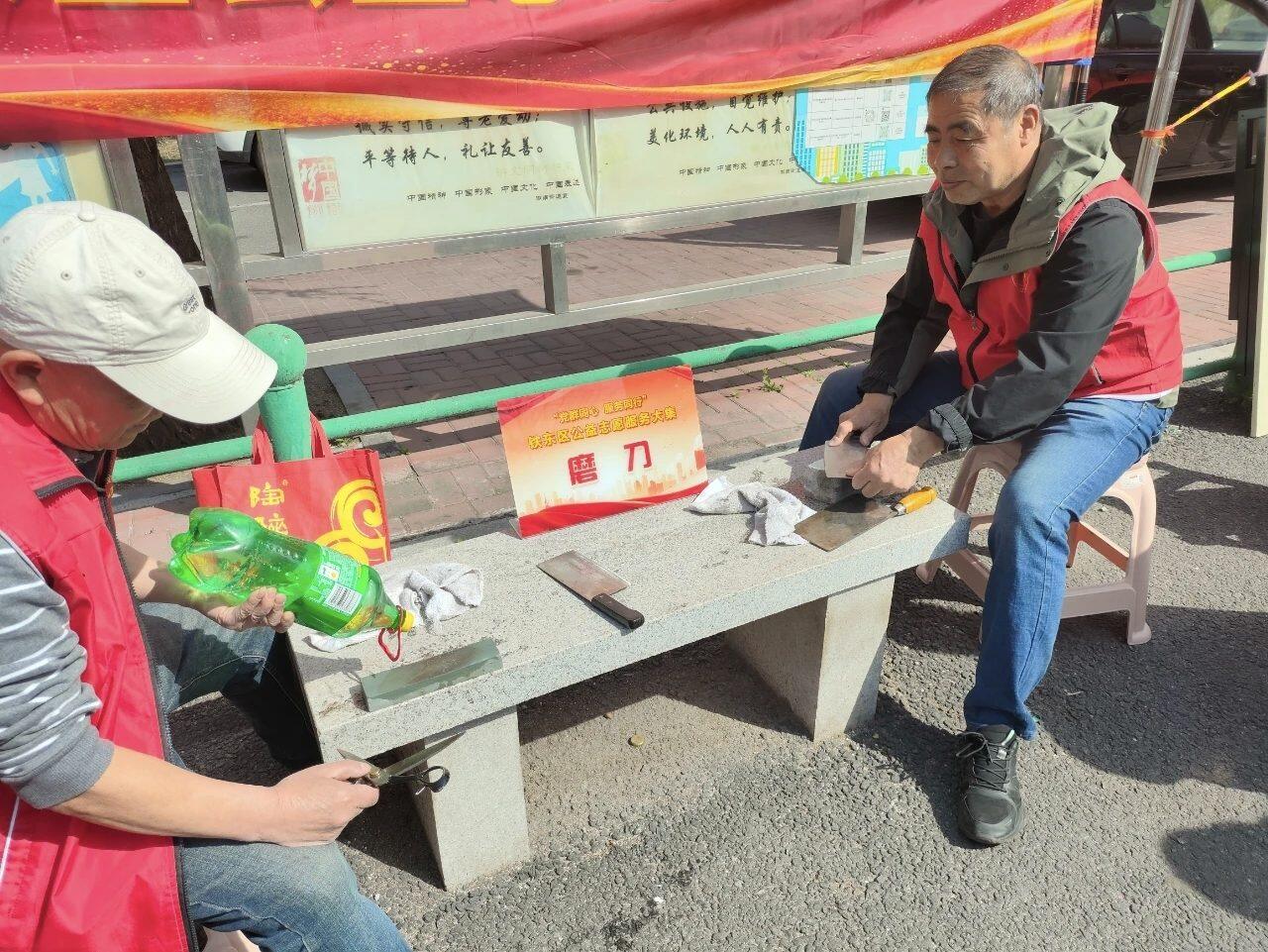 便民服务板块同样热火朝天。免费理发的摊位前,志愿者手持剪刀、推子,动作利落,不一会儿就为居民剪出一个清爽的发型。另一侧,磨刀服务点传来“嚓嚓”的磨刀声,志愿者细心地把居民送来的钝刀一把把打磨得锋利锃亮,赢得大家一致好评。