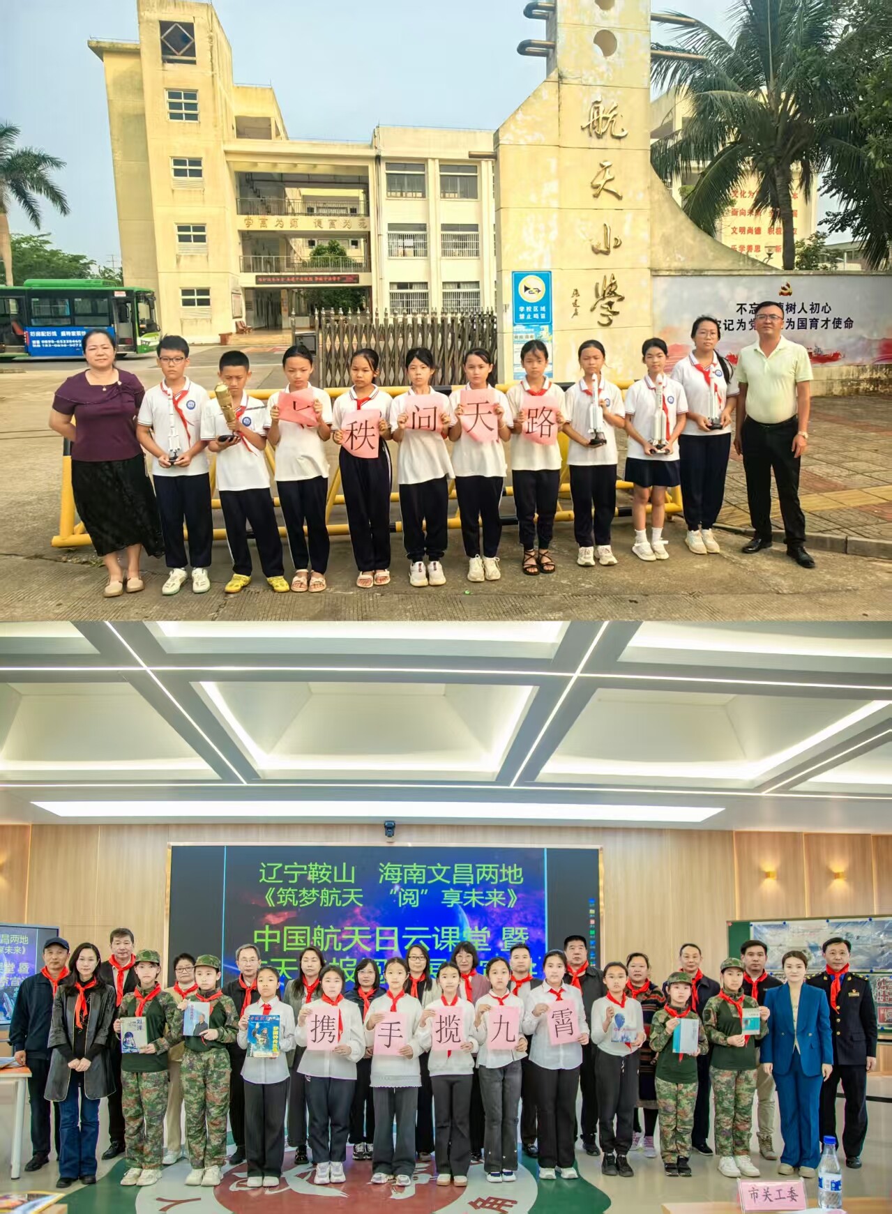 本次活动由市关工委、市精神文明办、市科协、团市委、市退役军人事务局等单位联合立山区相关单位、海南文昌航天小学共同主办,两地师生云端相聚,共赴航天文化与阅读融合的盛宴。活动紧扣“七秩问天路,携手探九霄”航天日主题,两地师生代表共同拼接航天主题云端合影,以创意形式展现携手传承航天精神的共同愿景。