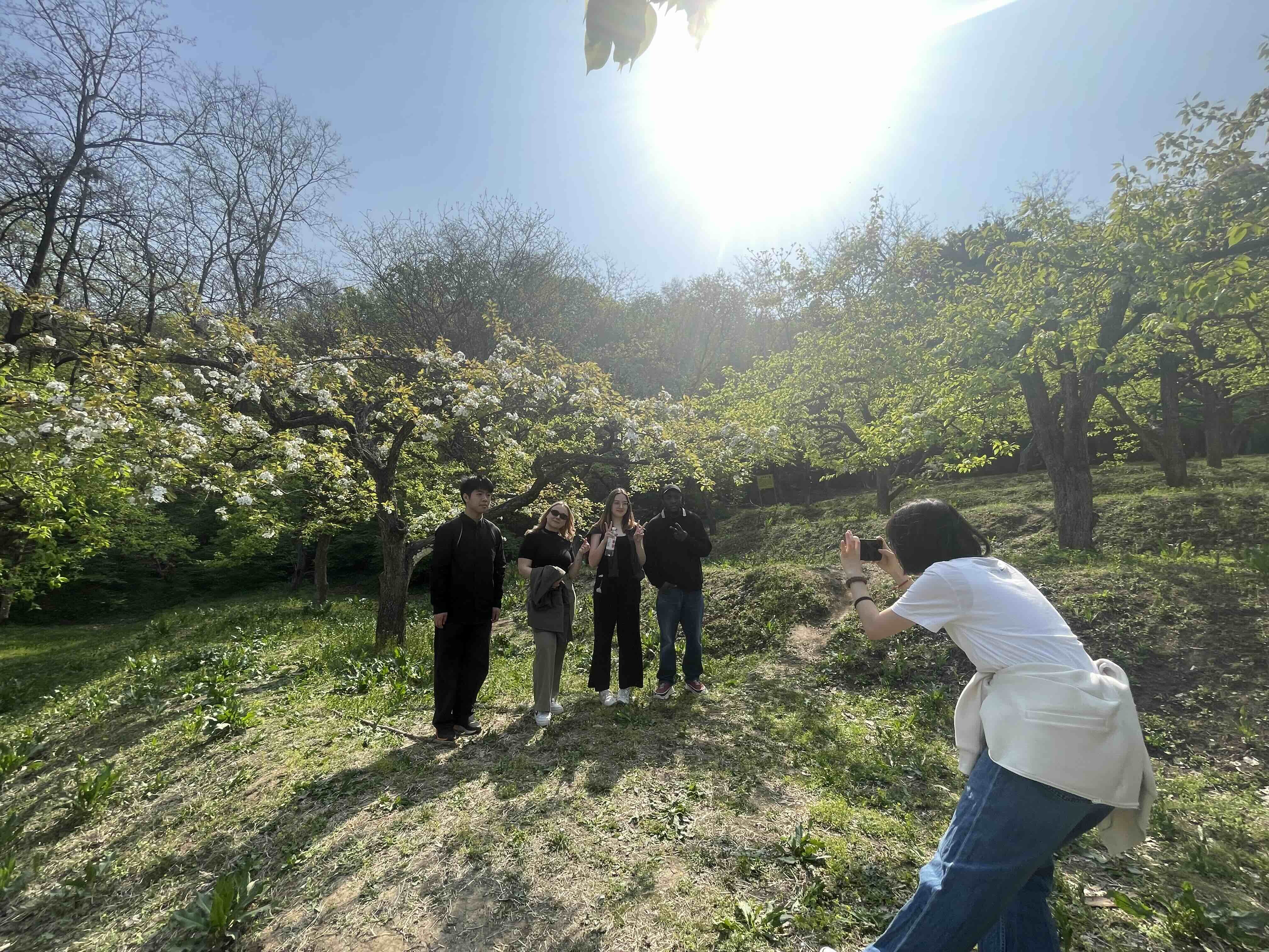 千山正门内春意盎然。中外青年学生在梨花树下合影留念,围绕梨花文化、民俗风情展开热烈的双语交流。中外青年结伴走进雨润梨园。梨园内,放眼望去,千树梨花竞相绽放,如云似雪,与千山的奇峰怪石相映成趣。留学生们纷纷举起手机摄影打卡,记录下这醉人的北国春光。