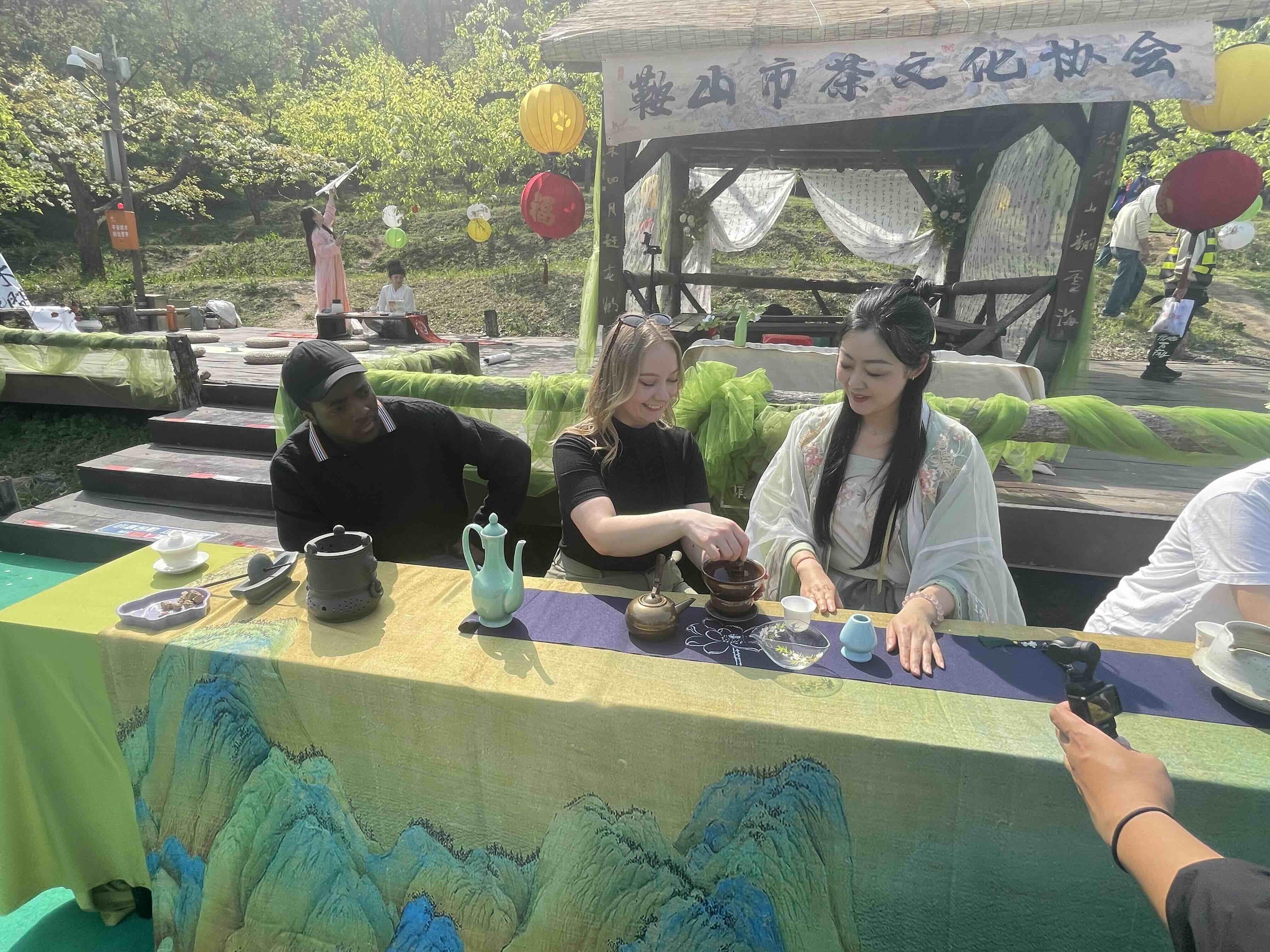 活动现场还设置了书画体验和茶艺展示区域,留学生们在挥毫泼墨间感受中国传统书画的写意之美,在茶香氤氲中品味东方生活的宁静致远。中外青年分成两组,用多语种现场介绍梨园风光,向朋友们热情推荐“千山梨花节”,让鞍山的生态之美跨越屏幕、走向世界。