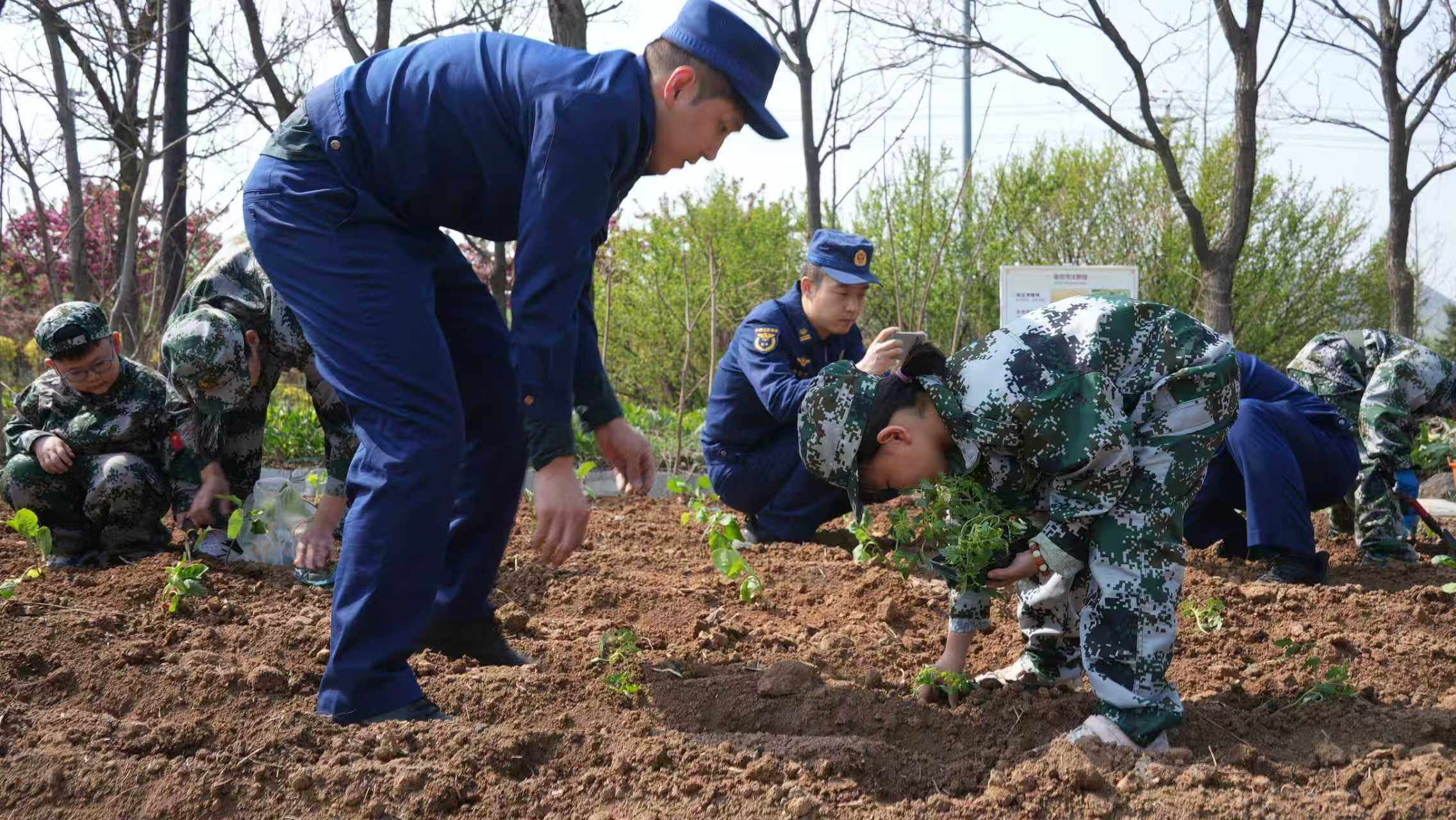放下行囊,同学们便跟着消防官兵们拿起了锄头、水壶,投入到农耕劳作中。平日里握笔写字的双手,此刻握紧了沉甸甸的农具,学着翻土、播种、浇水,动作虽略显生疏,却格外认真。有的同学弯腰翻土,有的同学小心翼翼地将秧苗放进挖好的土坑,消防员则在一旁耐心指导,欢声笑语回荡在田间地头。